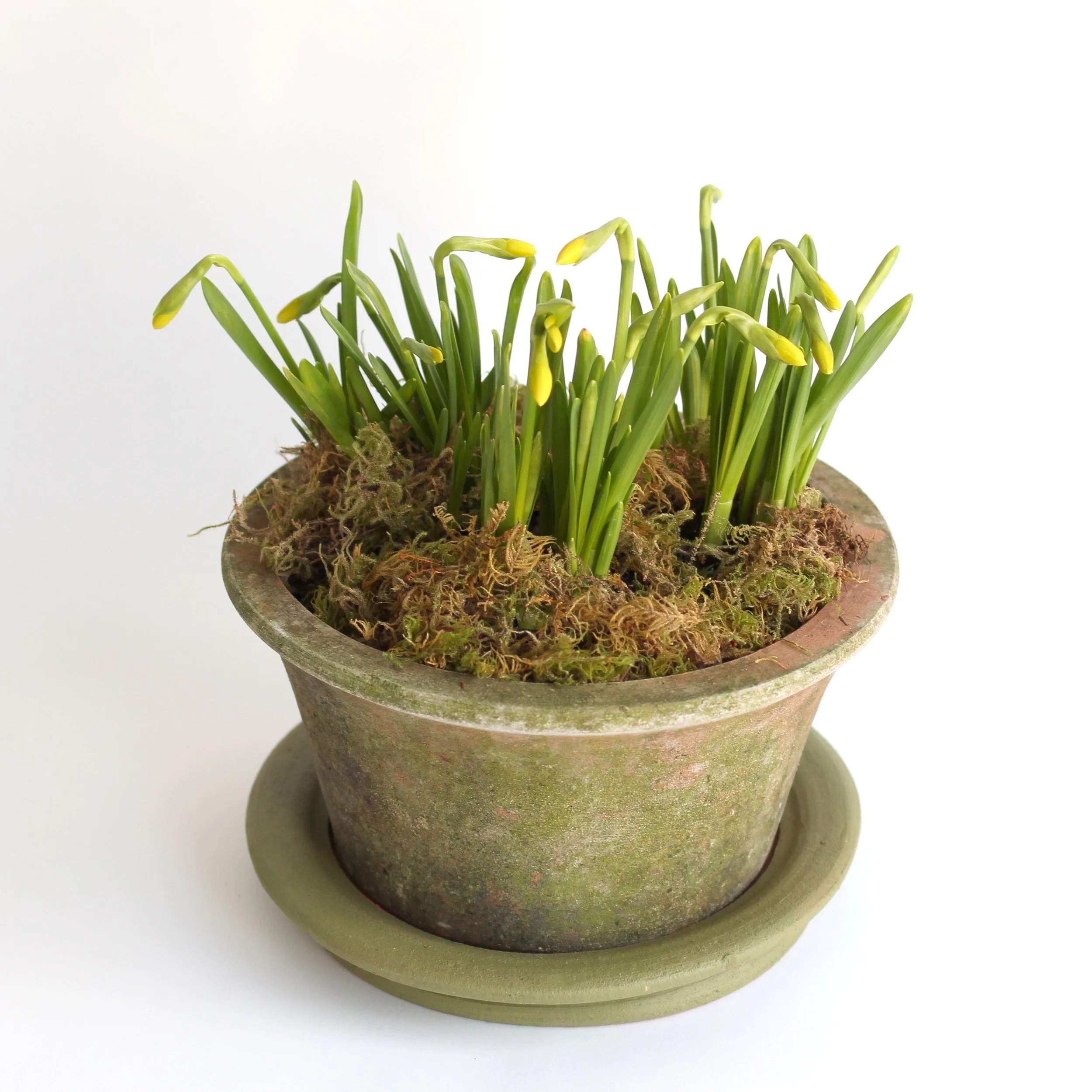 Aged terra cotta planters potted up with seasonal flowing plants. Chrysanthemum in Autumn. Paperwhite or amaryllis in Winter. Daffodils, germanium, or hyacinth in Spring.